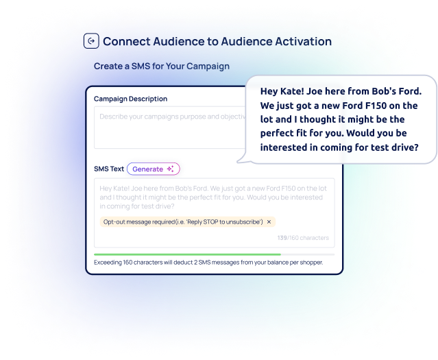 Fullpath’s AI automatically generates hyper-specific audiences pulled from your unified first-party data based on shopper needs and behaviors and automatically generates personalized dealership marketing text messages for each segment to drive engagement.
